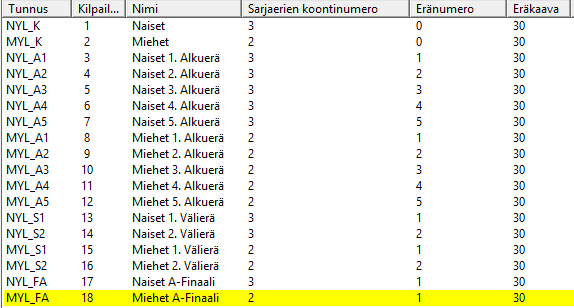 Toki kaikki alkukilpailujen sarjat on ensin käytävä läpi. Meillä Helsingin piirin sprinttikisoissa alkukilpailusarjoja oli useita ja sieltä tämä idea sarjatunnusten automaattiseksi generoinniksikin on peräisin.
