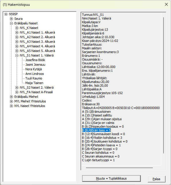 Samaan sarjaan (esim. Naisten yleinen) kuuluvat erät saavat saman sarjaerien koontinumeron. Näin voidaan kokonaistuloksia varten kasata yhteen kaikki erät ja urheilijan sijotukset niissä. ExTime pitää huolta tästä koontinumerosta, kun uusia erävaiheita perustetaan kisan edetessä. Pieleen menneet tai unohtuneet eräkoonnit voidaan paikata sarjan tietojen välilehdellä Keskellä näkyy tyyppillisen sprinttikisat sarjat kilpailujärjestyksessä, mukana on myös tuo koontinumero, erän numero ja sarjan oletushajotuskaava (30). Oletushajotuskaava asetetaan sarjan tiedoissa välilehdellä . Ihan oikealla näkyy kisan sarjat puurakenteena (suurennuslasi-ikoni). Sieltä näkyy, että erän taso on sijoitettu ATK-teknisesti tilalippuihin B, sen bitteihin 8 - 11. Välierän taso on siis 5. |