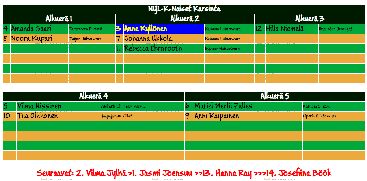 Vasemman reunan lista on karsinnan aikojen mukainen ja olen tallentanut kunkin jatkoerän (suora Finaali) alle siihen erään menevien urheilijoiden sijaluvut. Nyt saan eräjaon tehtyä yhdellä napilla .