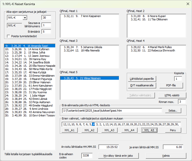 Olisin voinut myös valita ensin 6 parasta karsinnan listasta ja sitten klikata erän tunnusta N14_FA siirtääkseni valitut 6 urheilijaa A-finaaliin. Valinnat siirron jälkeen saa pois napilla . Valintoja voi tehdä myös yksitellen ja siirtää vaikkapa sama urheilija toiseenkin erään, vain viimeinen erävalinta pätee yhtä urheilijaa kohti. Varaa virhenäppäilyyn siis on.