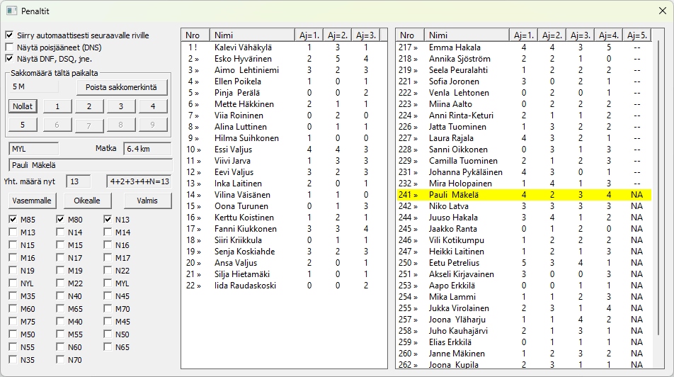 -nappi palauttaa sakkopaikan tilan takaisin kirjaamattomaksi. Se tarkoittaa ERI asiaa kuin nolla-sakkoa. Kisan lopussa ei kenelläkään saa enää olla kirjaamattomia sakkopaikkoja (NA), paitsi keskeyttäneillä/poisjääneillä.