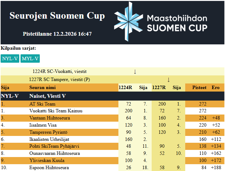 Uusimman päivityksen jälkeen käytän tätä myös tulevan Hopeasomman (Ristijärvi 2026) seurojen välisen pistekilpailun tilanteen laskentaan.