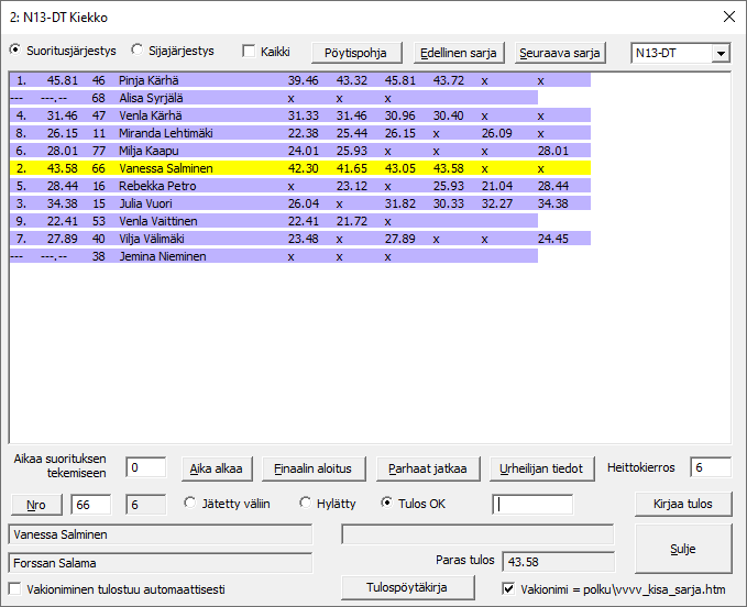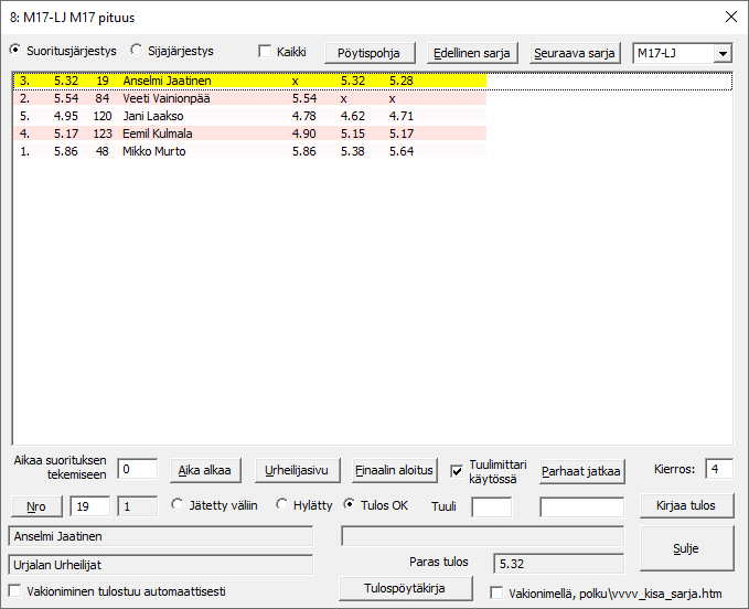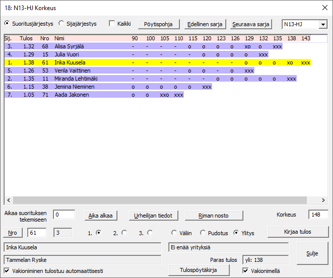 tuloskirjauksessa automaattisesti. Ja samat ohjeet pätevät tuloksen kirjaukseen kuin heittolajeissakin. Desimaalipiste/pilkku saa olla tai puuttua, tuloskenttään voi laittaa viivan tai x:n ja enter-näppäin korvaa Kirjaa tulos-napin kliksautuksen. Jos tulosjärjestys ei ole toivottu tasatuloksissa, niin silloin pitää mennä Sarjan tietoihin ja muuttaa siellä tasatilannetietoon IAAF:n sääntö 180.122 (välilehti Lajipiirteet). Sen pitäisi kyllä automaattilisäyksessä mennä paikalleen. Työjärjestys on lyhyesti kerrottuna seuraava:
