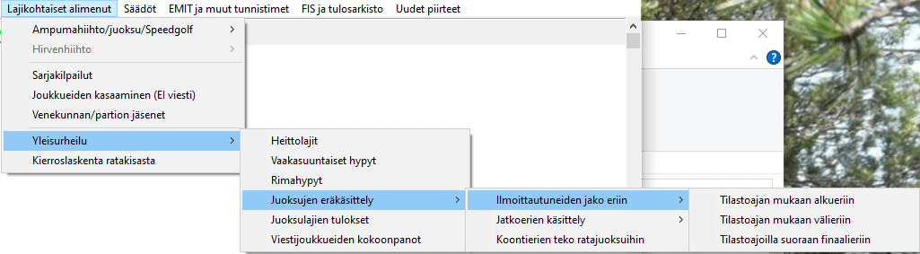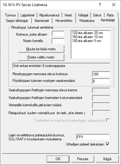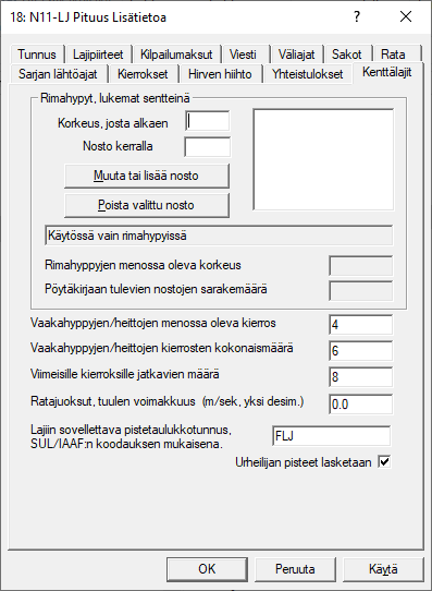 Tiettyihin lajeihin kuuluvat näytöt on versiosta 10 alkaen sijoitettu valikkoon Lajikohtaiset alimenut. Sieltä löytyvät nyt entiset ampumahiihdon sakkojen syöttönäytöt kuin myös uudet yleisurheilun kenttälajien tuloskirjausnäytöt. Jokaisella kenttälajiryhmällä, heitot, vaakasuuntaiset hypyt ja rimahypyt, on oma tuloskirjausnäyttönsä. Vaakahyppyjen ja heittojen ainoa ero on tuulimittarin lukeman sisäänkirjaus. Kussakin näytössä olen pyrkinyt siihen, että asia hoituisi joko pelkällä näppäimistöllä tai hiiren ja näppäimistön yhteiskäytöllä. Koontierien teko ratajuoksuihin on taas työkalu, jolla rakennetaan yksi juostava erä usean eri sarjan kilpailijoista. Tarpeen vain, jos juoksijoita ei jossain sarjassa ole täyteen erään asti.  |