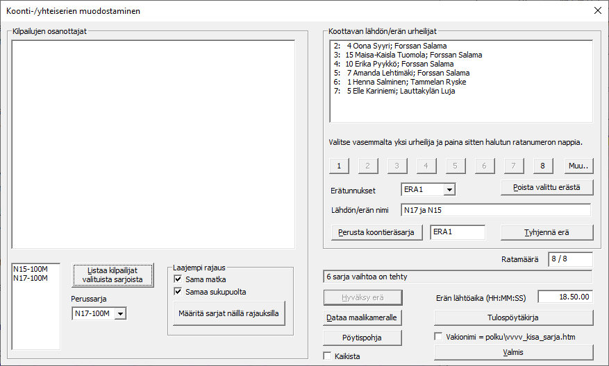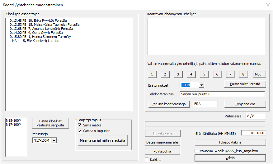 Oikealla on sitten valmis erä. Radat 1 ja 8 näyttää jääneen tyhjiksi. Näytöllä voidaan myös lisätä urheilijoita jo perustettuihin koontieriin tai tai poistaa niistä. Silloin ei erää perusteta, vaan erä valitaan Erätunnukset-listasta. Listassa näkyy teksti ..uusi merkkinä siitä, että nyt koostetaan uutta erää, jolle ei vielä ole perustettu omaa sarjatunnusta. Dataa maalikameralle-nappi tuottaa erästä lisärivejä lif-tiedostoon ja Pöytispohja-nappi tekee samanlaisen tuloskirjauspöytäkirjapohjan kuin kenttälajeissakin. Kun sarjassa on riittävä määrä urheilijoita useampaan erään, eräjaot kannattaa tehdä Muutokset-valikon Eräsarjojen käsittelyn työkaluilla. Perusjako ensin Tilastoajan mukaan alkueriin tai Tilastoajan mukaan välieriin toiminnoilla ja loppukilpailut sitten Jatkoerien käsittely-kohdasta löytyvillä näytöillä. Näitä työkaluja tulen tuunaamaan lisää toiveittenne mukaan.  |