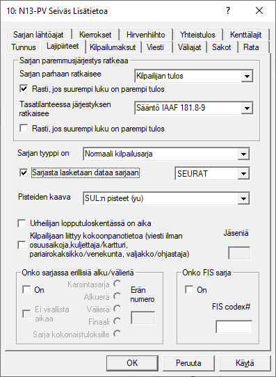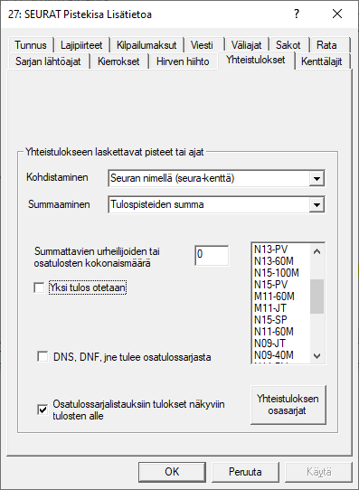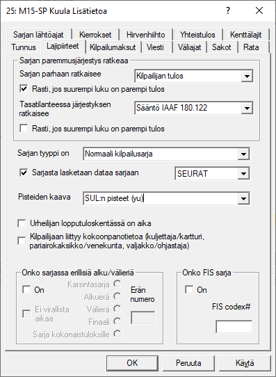 SUL:n pisteet (yu), joka kattaa SUL:n nuorten pistelaskennan.  Pistelaskentaa hienosäädetään Kenttälajit-välilehdellä. IAAF:n lajitunnuksen eteen laitetaan Pistetaulukkotunnus-kenttään F-kirjain, jos noudatetaan täällä esitettyä tapaa pistekaavojen koodauksesta (suosittelen). Lisäksi rastitaan Urheilijan pisteet rastitaan ruutu, jotta pisteet lasketaan automaattisesti kisan edetessä. Jos lajikohtaisesti halutaan seurata, mitkä seurat saivat tästä lajista pisteitä, on rastittava Yhteistulokset-välilehdellä Osatulossarjalistauksiin tulokset näkyviin tulosten alle. Sensijaan Kohdistamiseen ja Summaamiseen ei osatulossarjoissa tarvitse ottaa kantaa, ne menevät summauksen kohteena olevan sarjan mukaan.