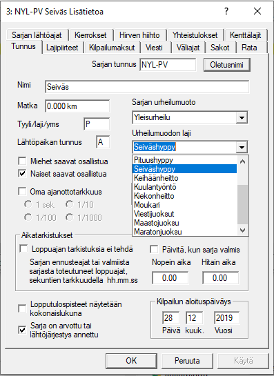 Yleisurheilun myötä täsmensin eri urheilulajien käsittelyä ExTimessä. Yhden päälajin, sarjan urheilumuoto, alle määritetään tarkemmin sarjassa kilpailtava laji. Oikealla oleva kuva selittää taas asiaa paremmin kuin tuhat sanaa. Osa sarjatiedoista ei ole käytössä yleisurheilun kenttälajeissa, esimerkiksi matka, mutta toisaalta mukaan tuli myös uusia tietoja, jotka näkyvät välilehdellä Kenttälajit (kun lajina on yleisurheilun laji). Sarjan lähtöaika on kenttälajeissa sarjan kilpailun aloittamisaika ja lähtöväli säännöissä määrätty yhden yrityksen max. suoritusaika. Sarjan tunnuksissa suosittelen esimerkeissä käyttämääni tapaa, jossa sukupuoli- ja ikäluokka-tietojen jälkeen lisätään lajin kansainvälinen lyhenne. Seiväshypyssä se on PV (Pole vault), kuulassa SP (Shot put), jne. Samaa lyhennettä tarvitaan myös, jos ja kun kenttätuloksista lasketaan pisteitä moniotteluihin tai vertailutarkoituksiin. Juoksuissa kilpailtava matka lisätään sellaisenaan alle kilometrin matkoissa, mutta sitä pidemmät lisätään satoina metreinä. 5000 metriä on lajilyhenteenä 50S ja 10000 metriä 100S. Aitajuoksuissa tulee sitten H-kirjain matkan jälkeen. 15 vuotiaiden poikien 300 metrin aitojen sarjatunnus olisi siis M15-300H, joka juuri sopii sarjatunnukselle varattuun 8 merkkiin. Oletusnimi-nappi laittaa yleisurheilussa lajitiedon sarjan nimeksi. Sarjat ja kilpailjat kannattaa lisätä suoraan SUL:lta tulevasta ilmoittautuneet.txt-tiedostosta, sitä varten löytyy oma nappi YU txt excel-siirtojen ikkunasta. Tämän lisäyksen jälkeen on vielä sarjat/lajit asetettava aikataulujärjestykseen ja päätettävä urheilijoiden keskinäiset suoritusjärjestykset (on sama kuin juoksuissa lähtöratatieto). Sarjojen perustamisen velho toimii myös yleisurheilussa, samalla kertaa voidaan kerralla lisätä vaikkapa kaikkien ikäluokkien kuulantyöntö sarjat ja heti perään sitten jokin illan hyppylajeista ja lopuksi sitten juoksulajit. Ohjeissa ja ExTimessä käytän IAAF:n säännöistä löytämiäni termejä rimahypyt ja vaakahypyt.  |