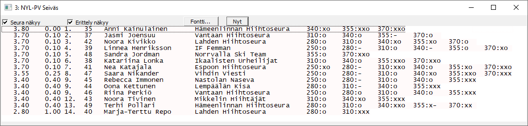 | Vaakahyppyjen kirjausnäyttö on taas melkein sama kuin heittolajeissa.