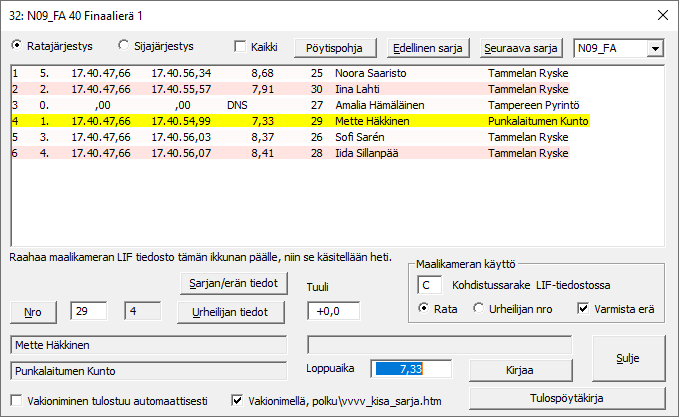 Varmista erä-rastittuna ei hyväksy aikoja automaattisesti, jos LIF-tiedostossa oleva erän tunnus on eri kuin näytössä valittu. Maalikameran tuottama LIF-tiedosto yksinkertaisesti raahataan hiirellä kirjausnäyttöön ja ajat on sillä kirjattu (kun kaikki alustavat työt on tehty hyvin). Ratamuutokset ja siitä johtuvat virheet voidaan korjata helposti käsin. Valitaan urheilija, jolloin hänen aikansa tulee valittuna Loppuaika ruutuun. Kun siihen tilalle kirjataan uusi aika ja painetaan enter (tai hitaammin klikataan Kirjaa-nappia), uusi loppuaika korvaa vanhan loppuajan (ja samalla maaliintuloajan) ja ExTime valitsee seuraavan radan urheilijan. Jos tuulen voimakkuus halutaan kirjata (tai muuttaa), muutos menee sarjan tietoihin, kun uusi lukema päätetään enter-näppäimellä (CR). Sen perillemeno voidaan helposti tarkistaa klikkaamalla nappia Sarjan/erän tiedot.  |