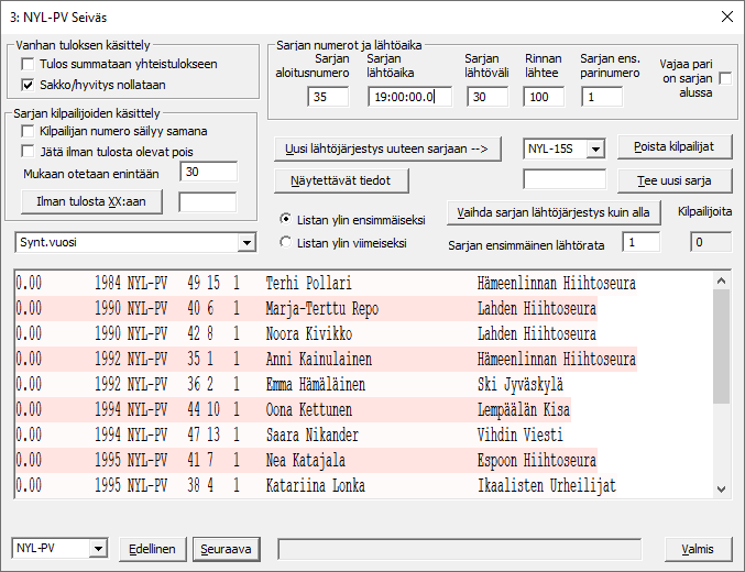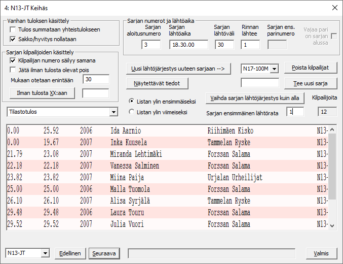 Kun yleisurheilijat lisätään napilla YU txt (näytössä Säädöt/Excel-parametrit ja arkisto), jokainen urheilija osallistuu oletuksena samalla numerolla kaikkiin lajeihin. Lajikohtaisesti oikeastaan ainoa tarvittava temppu on suoritusjärjestyksen määrääminen, vastaa hiihdon arvontaa siis. Samalla pitää lajit/sarjat aikatauluttaa valtakunnan kellon aikaan. Siihen ehdotan Muutokset valikosta löytyvää työkalua Lähtöjärjestykset usealla ei perusteella. Alempana siitä lisää.