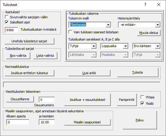 Yläosassa on nappi Pöytispohja, jolla saadaan tulostettua käsin tehtävään tuloskirjaukseen pöytäkirjapohja. Jos lisäksi napin vasemmalla puolella oleva kohta Kaikki on rastittu, samalle sivulle tulostuvat kaikki saman lajin sarjat. Pöytäkirjan alkuun tulostuu Varanumerot-tiedolla ilmoitettu määrä tyhjiä paikkoja. Ja tämä varanumerot-tietohan löytyy sarjan tiedoista välilehdellä Sarjan lähtöajat, jossa se saadaan talteen kaikkia sarjoja koskevaksi napilla Tee näistä oletusarvot. Pöytäkirjan yläosan ja alaosan logot ovat samat, kuin mitä on Netti-lähtölistojen omaan malliin määritetty.
