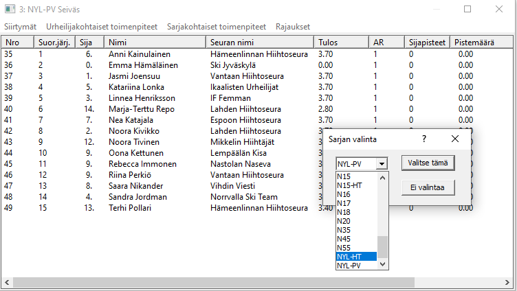 Yleisurheilun iltakisoissa (ainakin silloin kun itse olin mukana 1960-luvulla Junkkarien kentällä Kiistolassa) on tapana pyöräyttää muutama laji läpi kaikille ikäluokille. Tämä onnistuu helposti ExTimessä. Sarjan tilanne-näytössä valitaan Sarjakohtaiset toimenpiteet menusta kohta Kopioi kilpailijat toiseenkin sarjaan ja sitten esiin tulevasta sarjavalikosta valitaan oikea, tietysti jo perustettu, sarja. Esimerkissä kaikki naisten seipääseen osallistujat kopioituvat myös moukarin heittoon. Ja muutama ei-osallistuja sitten poistetaan ja pari uutta urheilijaa lisätään käsin. Numerot, nimet, sporttiID:t, seurat ja suoritusjärjestys säilyvät samoina, tulokset vain nollataan. Esimerkin nimet saattavat tuntua oudoilta, mutta hyvin se onnistui hiihtosarjasta urheilijoiden kopiointi yleisurheilusarjoihinkin. Tulokset ovat tietysti sitten ihan hatusta vedettyjä.  |