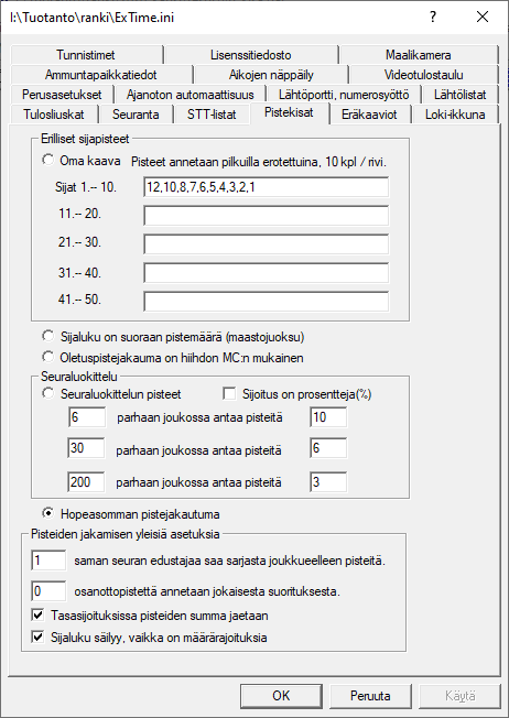 SUL-käyttämä pistetaulukko on sen sijaan ExTimessä sijoitettu ExTime.ini-tiedostoon, ja sitä käyttäjä voi itse muuttaa. En ajatellut tehdä muuttamiseen erillistä työkalua, vaan halukkaat saavat käyttää siihen vaikkapa Muistiota tai Notepadiä ja editoida suoraan extime.iniä. Alla vasemalla suora kopio extime-ini-tiedostosta ja oikealla siihen selitystä.