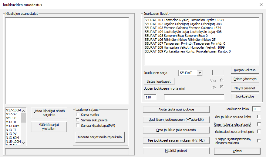 Seurat saadaan näppärästi perustettua tähän perustettuun Pistekisa-sarjaan Lajikohtaiset alimenut-valikosta löytyvällä työkalulla Joukkueiden kasaaminen (EI viesti). Kun oikeat lajisarjat oli jo rastittuina, riitää kun antaa seuroille jonkin aloitusnumeron (annoin 101) ja klikkaa nappia Oma joukkue joka seurasta. Joukkueen koon annetaan olla nollassa, koska yli lajien menevää rajoitetta ei ole olemassa. Ruutu Ilman tulosta olevat pois jätetään rastimatta, koska tein tämän ennen kisan aloittamista, eikä kenelläkään ollut tietysti vielä tulosta.  |