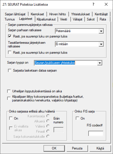 Ihan ensiksi kisaan perustetaan yksi sarja, johon lasketaan seurakohtaiset pistesummat ja johon osallistujiksi sitten merkitään kaikki kisassa olevat seurat. Tunnus-välilehdellä kannattaa rastia ruutu Lopputulospisteet näytetään kokonaislukuna ja sarjan kilpailujärjestys on varmaankin syytä laittaa kisan viimeiseksi sarjaksi. Sarjan Lajipiirteet-sivulla (esimerkki alla vasemmalla) ilmoitetaan, että sarjan parhaan ratkaisee Pistemäärä ja että suurimman lukeman kerännyt seura on paras. Sarjan tyypiksi valitaan Seuran/joukkueen yhteistulos eikä urheilijan (tässä tapauksessa siis seuran) lopputuloskentässä ole aikaa. Sarjan tietojen Yhteistulokset sivulla (esimerkki alla oikella) säädetään tarkemmin, mitkä lajit (nappi Yhteistuloksen osasarjat ) ja miten urheilijat sarjoistaan kohdistetaan oikealle seuralle (vaihtoehto Seuran nimellä) ja millä perusteella seura saa yhteistulokseensa dataa (Tulospisteiden summa).  |