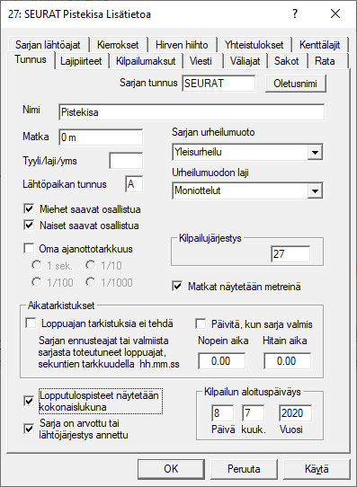 Kun erään tulevat urheilijat on kaikki valittu, erälle annetaan erätunnus ja nimi sekä erän arvioitu lähtöaika ja painetaan nappia Perusta koontieräsarja. Tämä voidaan toki tehdä jo ennen urheilijoiden erään lisäämistäkin. Vasta nappi Hyväksy erä päivittää muutokset.
